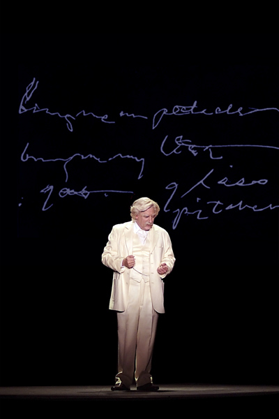 Richters, a young, dark-haired man, undergoes a remarkable transformation for the show. He appears as the crusty gray-haired author in his advanced years. The white linen suit, cigar and whiskey, of course, are standard props for the characterization.